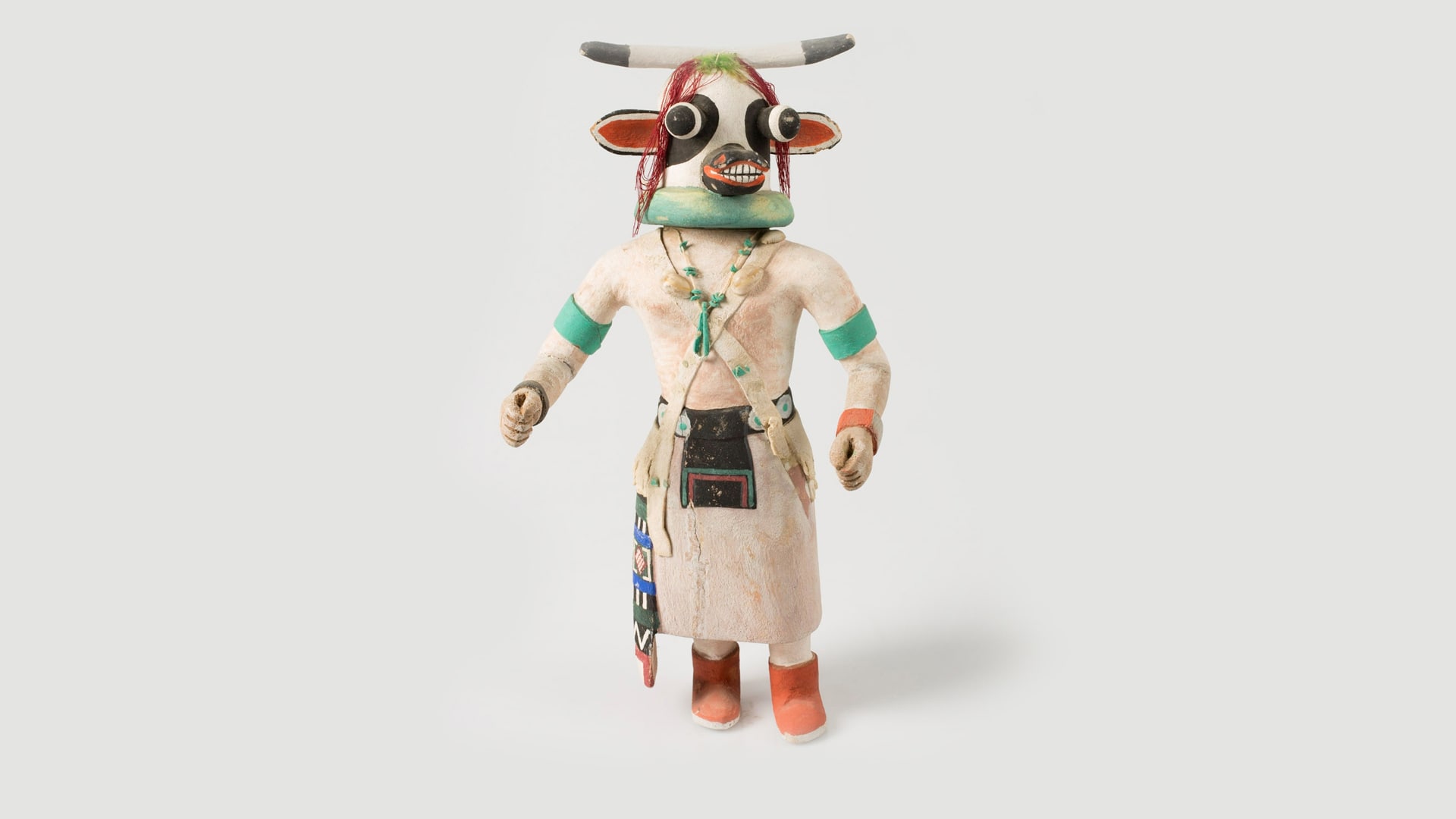 Kopf und Körper werden durch eine hölzerne, abgerundete Halskrause voneinander abgegrenzt, deren hellblaue Fassung leicht fragmentiert ist. Das gleiche gilt für den Körper und den Rock, wo die weiße Farbe teilweise das Braun des Holzes sichtbar lässt. Um den Hals hängt eine Kette mit abwechselnd länglichen weißen und kleinen türkisfarbenen und steinförmigen Elementen, die auf Brusthöhe mit einem langen türkisfarbenen Anhänger endet. Über den breiten Schultern und quer über den Oberkörper laufen überkreuzt weiße Schärpen, die mit Muscheln geschmückt sind. Ihre Enden hängen an den beiden Seiten der Hüfte ab und bedecken damit teilweise den aufgemalten schwarzen Gürtel, mit dem der weiße Rock an die Taille gebunden ist. An dem Gürtel hängt vorne eine schwarze Gürteltasche und auf der rechten Seite ist eine bunte Stoffbahn befestigt, die bis über das Rockende reicht. Darunter werden ockerfarbenen Mokassins mit weißen Sohlen sichtbar.
